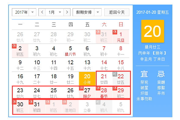 一、放假時(shí)間:2017年1月21號(hào)至2月5日放假,共16天;2月6日(年初十)正常上班;